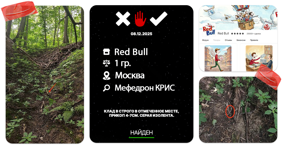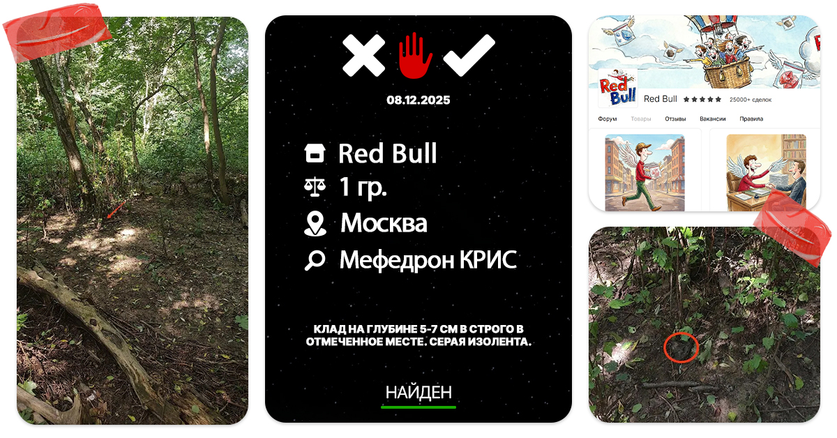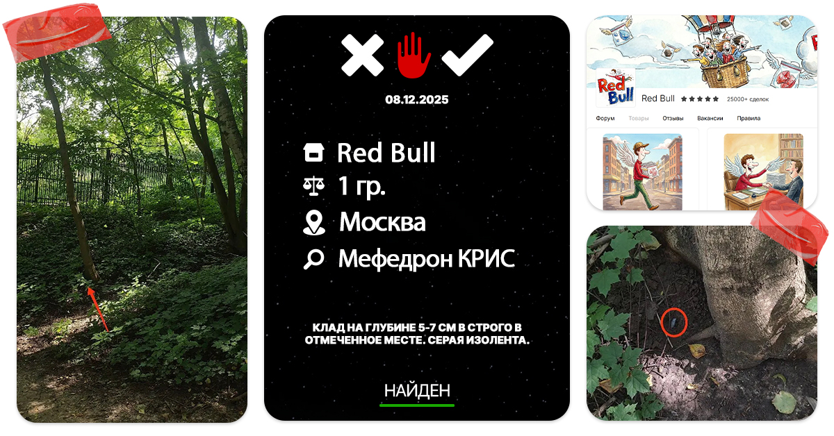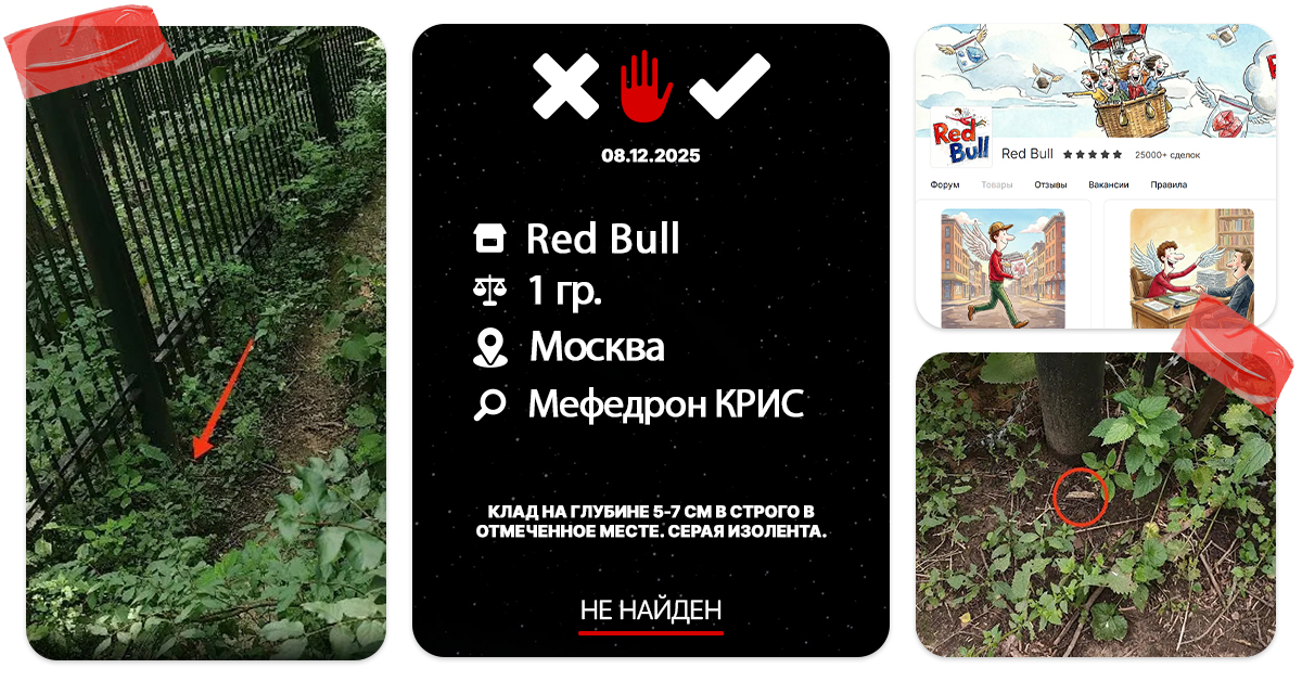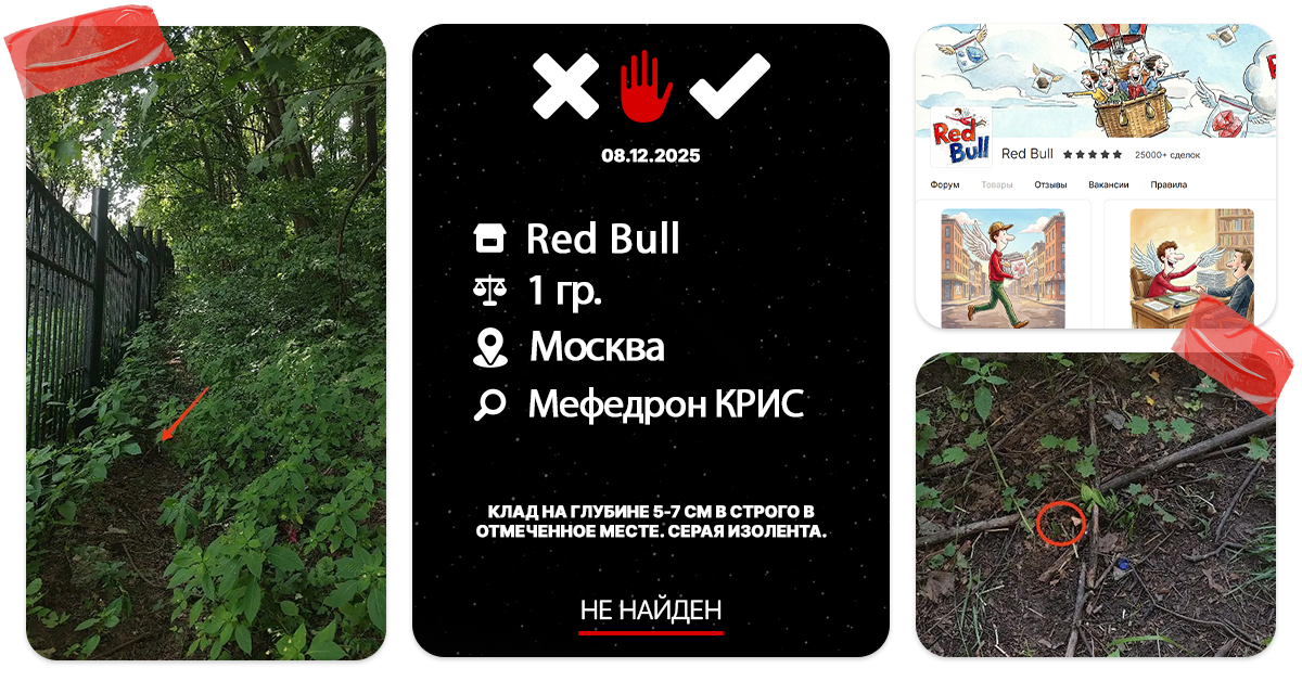 Результат проверки: По результатам контрольной закупки в магазине «Red Bull» из 5-и адресов было найдено 3-и. По ненаходам магазин идёт навстречу. Визуальные характеристики товара соответствуют заявленным на витрине. Качество работы курьера/оформление квеста оценивается на 7/10.